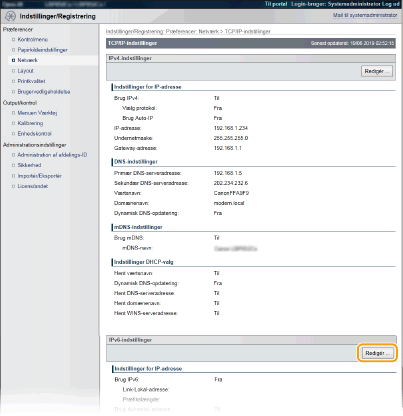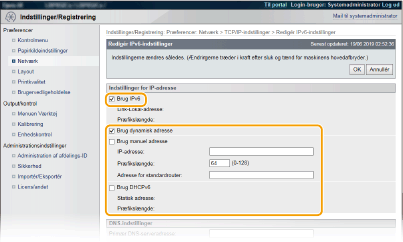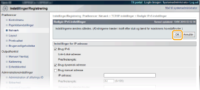Kontrol af, om indstillingerne er korrekteSørg for, at skærmbilledet for Brugerinterface til fjernbetjening kan vises sammen med din computer ved at bruge maskinens IPv6-adresse. Brug af Brugerinterface til fjernbetjening Valg af indstillinger fra kontrolpaneletDu kan også aktivere eller deaktivere IPv6-adresser fra indstillingsmenuen på kontrolpanelet. IPv6-indstillinger Hvis du har ændret maskinens IP-adresse efter installeringen af printerdriverenDu skal angive den port, der skal bruges igen. For portændringsproceduren henvises til manualerne for de relevante drivere på hjemmesiden for online-manualer. |