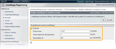 2 | Marker afkrydsningsfeltet [Underret], og angiv de påkrævede indstillinger. ![]() [Underret] Marker afkrydsningsfeltet for at give software til styring af enheder besked om, om maskinen er tændt eller slukket. Når [Underret] er valgt, kan du forvente, at maskinen undgår unødvendig kommunikation i dvaletilstanden, så det samlede strømforbrug reduceres. [Portnummer] Rediger portnummeret for denne funktion i overensstemmelse med netværksmiljøet. [Antal routere der skal passeres] Angiv, hvor mange routere meddelelsespakkerne kan passere. [Beskedinterval] Angiv, hvor ofte maskinen giver software til styring af enheder besked om, hvorvidt den er tændt eller slukket. |
