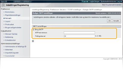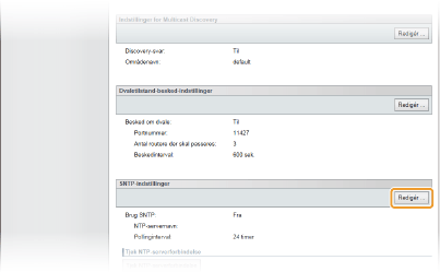 Maskinens SNTP understøtter både NTP- (version 3) og SNTP-servere (version 3 og 4). |