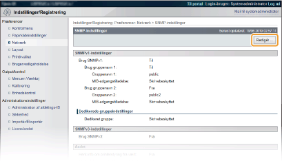 Deaktivering af SNMPv1Hvis SNMPv1 er deaktiveret, vil nogle af maskinens funktioner ikke være tilgængelige, f.eks. hentning af maskinoplysninger via printerdriveren. Brug af kontrolpaneletDer kan også opnås adgang til indstillingerne for SNMP fra indstillingsmenuen på kontrolpanelet. SNMP-indstillinger |