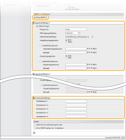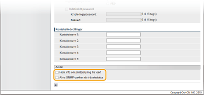 Hvis du vælger afkrydsningsfeltet, kan programmer, der anvender SNMP-protokollen, som f.eks. Canon software imageWARE Series, blive deaktiveret for at få adgang til maskinen.
