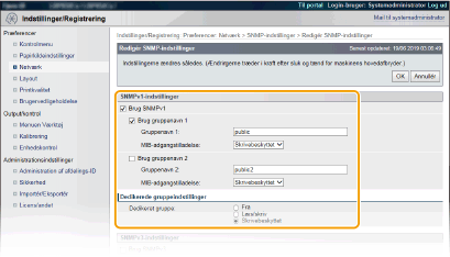 For hvert community skal du vælge [Læs/skriv] eller [Skrivebeskyttet] i forhold til adgangsrettighederne til MIB-objekter.