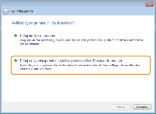 Hvis du bruger Windows Vista/7/Server 2008, skal du klikke på [Tilføj netværksprinter, trådløs printer eller Bluetooth-printer].