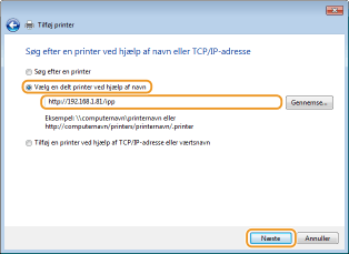 Hvis du bruger en DNS-server, skal du indtaste "<maskinens værtsnavn>.<domænenavn>" i stedet for "maskinens IP-adresse" (eksempel: https://min_printer.eksempel.com/ipp).