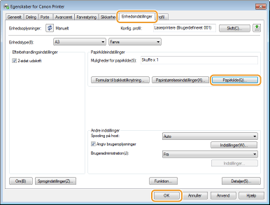 Hvis den valgfri papirfremfører eller kassetteindføringsenhed er sat på maskinen, skal du udføre den følgende betjening af printerdriveren på forhånd.