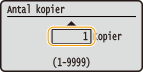 Angiv antallet af kopier. Brug taltasterne for at angive et antal, og tryk på