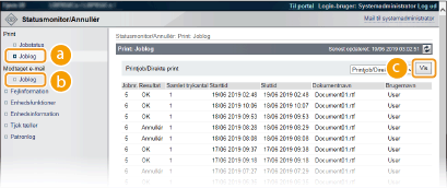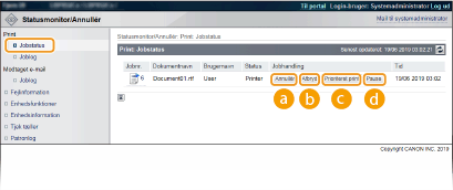 Status for alle udskrivningsjob vises uanset indstillingerne for administration af afdelings-id. Standardindstillingerne forhindrer visse handlinger, som f.eks. at slette et dokument i at blive udskrevet eller forstyrre et udskrivningsjob, i at blive udført i tilstande som generel bruger. Hvis du ønsker at anvende dokumenter i tilstand som generel bruger, skal du logge på i administratortilstand og aktivere [Tillad generel brugers jobhandling]. Gøre slutbrugerne i stand til at bruge dokumenterne Hvis du indtastede dit brugernavn, da du loggede på som almindelig bruger, vises dit brugernavn kun på de dokumenter, som du udskrev. Klik på [Jobnr.] på de midlertidigt afbrudte dokumenter, og sikr dokumenter for at vise detaljerede oplysninger. Du kan kontrollere brugernavnet og sideoptællingen for det udskrevne dokument. |
