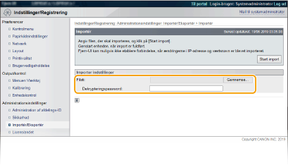Angiv den indstillingsfil, der skal importeres, og indtast adgangskoden.
