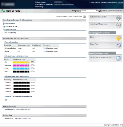 [Administrationsstatus]Du kan foretage alle handlingerne og indstillingerne i Brugerinterface til fjernbetjening. Angiv systemadministratoradgangskoden i [Password].