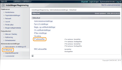 Brug af kontrolpaneletDu kan også aktivere eller deaktivere IP-adressefiltrering fra indstillingsmenuen på kontrolpanelet. Adressefilter |