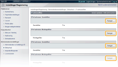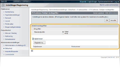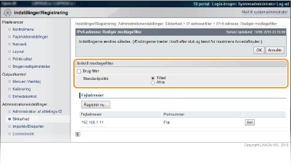 2 | Angiv adresseundtagelser. Indtast IP-adressen (eller IP-adresseområdet) i [Registrér adresser], og klik på [Tilføj]. Kontrollér, om der er indtastningsfejl Hvis IP-adresserne er indtastet forkert, kan du muligvis ikke få adgang til maskinen fra Brugerinterface til fjernbetjening. I dette tilfælde skal du angive <Adressefilter> til <Fra>. AdressefilterHvis du har valgt [Afvis] under [Standardpolitik] Tilbageloop, multicast- og broadcast-pakker kan ikke filtreres. Sletning af en IP-adresse fra undtagelser Vælg en IP-adresse, og klik på [Slet]. |