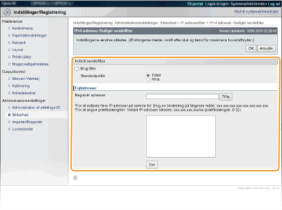 Hvis du vælger [Tillad] under [Standardpolitik], skal du angive IP-adresserne for enheder, hvor kommunikationen med maskinen burde være blokeret. Hvis du vælger [Afvis] under [Standardpolitik], skal du angive IP-adresserne for enheder, der burde kunne kommunikere med maskinen.
