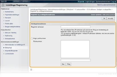 2 | Angiv adresseundtagelser. Indtast IP-adressen (eller IP-adresseområdet) i [Registrér adresser]. For at angive et portnummer skal du vælge afkrydsningsfeltet [Angiv portnummer], indtaste et portnummer i [Portnummer] og klikke på [Tilføj]. Kontrollér, om der er indtastningsfejl Hvis IP-adresserne eller portnumrene er indtastet forkert, kan du muligvis ikke få adgang til maskinen fra Brugerinterface til fjernbetjening. I dette tilfælde skal du angive <Adressefilter> til <Fra>. AdressefilterSådan slettes et indstillet portnummer Vælg det portnummer, der skal slettes, og klik på [Slet]. |