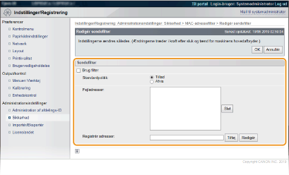 1 | Markér afkrydsningsfeltet [Brug filter], og klik på [Tillad] eller alternativknappen [Afvis] for [Standardpolitik]. [Brug filter] Markér afkrydsningsfeltet for at begrænse kommunikation. Ryd afkrydsningsfeltet for at deaktivere begrænsningen. [Standardpolitik] Vælg betingelsen for at tillade eller afvise andre enheders kommunikation med maskinen. [Tillad] | Vælg for at blokere kommunikationspakker, når de sendes til eller modtages fra enheder, hvis MAC-adresser er indtastet i [Fejladresser]. Kommunikation med andre enheder er tilladt. | [Afvis] | Vælg for kun at godkende kommunikationspakker, når de sendes til eller modtages fra enheder, hvis MAC-adresser er indtastet i [Fejladresser]. Kommunikation med andre enheder er ikke tilladt. |