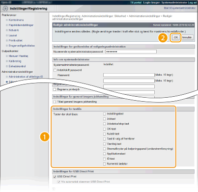 Du kan vælge afkrydsningsfeltet for at låse den korresponderende tast, selv hvis der trykkes på den på kontrolpanelet. Fjern markeringen i afkrydsningsfeltet for at låse tasten op. Du kan også låse opsætningstasten fra kontrolpanelet (Adm.indstill.).