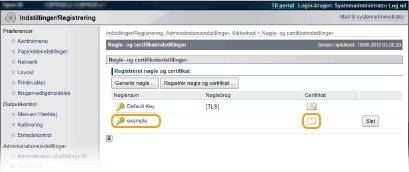 Klik på [Nøglenavn] eller [Certifikat] for det certifikat, der skal registreres.
