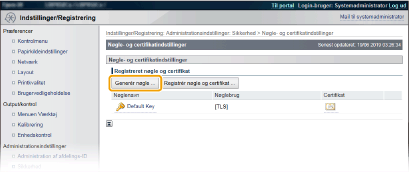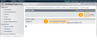 Der kan genereres et nøglepar med maskinen, når det er nødvendigt til krypteret kommunikation via TLS (Transport Layer Security). Du kan bruge TLS, når du får adgang til maskinen via Fjern-UI eller udfører IPP-udskrivning. Der kan registreres op til otte nøglepar, inklusive dem der er indstillet på forhånd. Selvsignerede certifikater bruges med nøglepar genereret i "Netværkskommunikation". Med en "Nøgle og anmodning om signering af certifikat (CSR)" kan du søge om et CA-udstedt digitalt certifikat for det nøglepar, der genereres af maskinen.