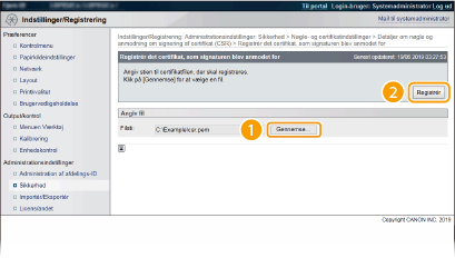 Klik på [Gennemse] i [Filsti], angiv filen til CRS (certificate signing request), og klik på [Registrér].