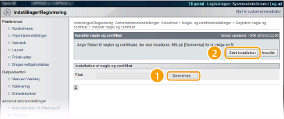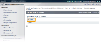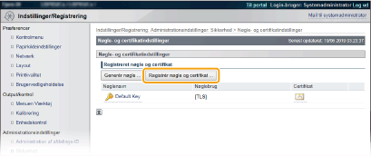 Klik på [Nøgle- og certifikatindstillinger] for at installere et nøglepar eller [CA-certifikatindstillinger] for at installere et CA-certifikat.