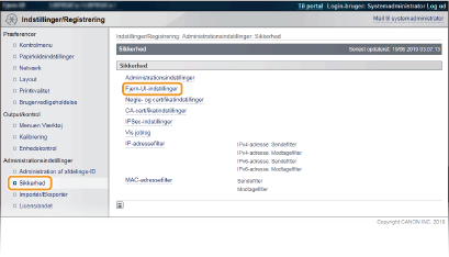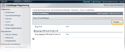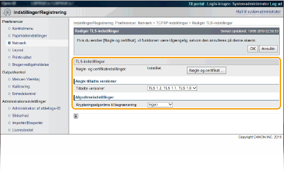 Hvis TLS allerede er aktiveret via [Fjern-UI-indstillinger] eller [IPP-printindstillinger], vises [Standardnøgleindstillinger] ikke. For at ændre den nøgle, der skal anvendes, henvises til trin 6, og ryd afkrydsningsfelterne [Brug TLS] under [Fjern-UI-indstillinger] eller [IPP-printindstillinger] respektivt.