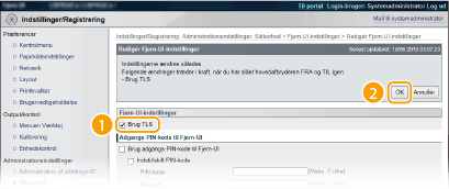 3 | Marker afkrydsningsfeltet [Brug TLS], og klik på [OK]. [Brug TLS] Marker afkrydsningsfeltet for at bruge TLS til kommunikation via Brugerinterface til fjernbetjening. Hvis du ikke bruger dette, skal du fjerne markeringen i afkrydsningsfeltet. |