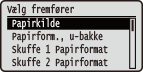 ![]() | Alle indstillingerne om papirkilde og størrelsen af det format papir, der er lagt i maskinen, vises med korte beskrivelser. Når du trykker på ( ) på kontrolpanelet, vises menuen Vælg Fremfører. Standardindstillingerne er angivet med en daggert ( ). |