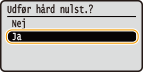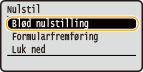 | Du kan annullere alle processer, slette data i hukommelsen og slukke for strømmen. Hvis du trykker på  (  ) på kontrolpanelet, vises menuen Nulstil. |