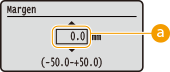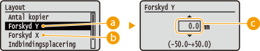 Du kan vælge <Justér printplacer.> under <Brugervedligehold.> til at finjustere udskrivningspositionen for hver papirkilde. Området for de tilgængelige forskydningsværdier er fra -5,0 mm til +5,0 mm i vertikal retning og fra -3,5 mm til +3,5 mm i horisontal retning. Justering af udskrivningsposition |