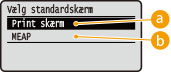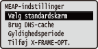 ![]() | Indstillingspunkterne om hovedskærmen på MEAP vises med korte beskrivelser. Standardindstillingerne er angivet med en daggert ( ). |