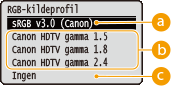 sRGB v3.0 (Canon)  Canon HDTV gamma 1.5 Canon HDTV gamma 1.8 Canon HDTV gamma 2.4 Ingen |
