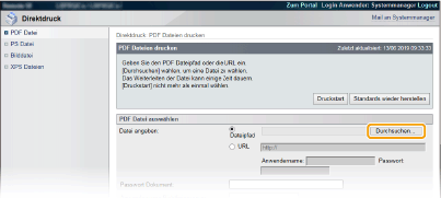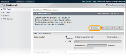 Sie können eine Datei über einen Webbrowser (Remote UI) drucken, ohne die Datei öffnen zu müssen. Außerdem können Sie ebenfalls eine PDF-Datei am Web drucken, indem Sie lediglich die URL angeben.