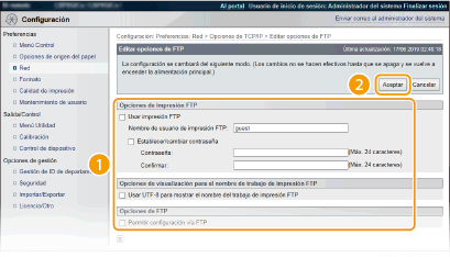 Para realizar la impresión mediante cliente FTP, marque la casilla de verificación. De lo contrario, quite la marca de la casilla de verificación.