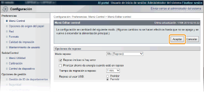 Puede configurar el equipo para que se apague automáticamente si no se utiliza durante un periodo prolongado. También puede configurar el equipo para que se apague a una hora determinada. Estas funciones le permiten evitar el consumo energético innecesario derivado de no apagar la alimentación. De forma predeterminada de fábrica, esta función está habilitada.