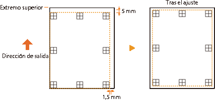 . Determine la dirección y la distancia para ajustar a partir de esas marcas. Si la posición de impresión es normal, todas las marcas se imprimen en una posición 5 mm del borde más cercano del papel.