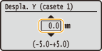 Puede utilizar <Desplazar Y> y <Desplazar X> en el menú de configuración del panel de control para ajustar las posiciones de impresión de todos los tipos de impresión con independencia del origen del papel. Puede ajustar la posición de impresión en el intervalo de -50,0 mm a +50,0 mm en incrementos de 0,5 mm en cada dirección: vertical y horizontal. Desplazar Y/Desplazar X |