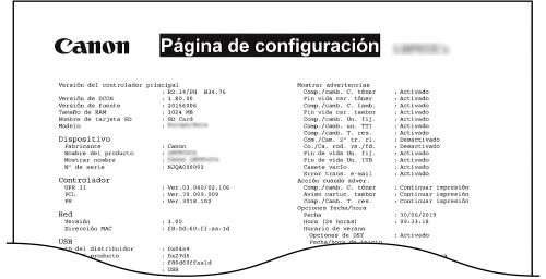 Menú de configuración), el contenido registrado en el equipo y otra información en forma de lista. El resto de información consiste en el estado del cartucho de tóner, el número de páginas impresas y la capacidad de la memoria (RAM) del equipo. Los elementos de configuración cuyo nombre va precedido de un asterisco (