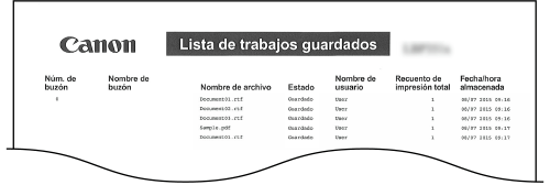 Puede imprimir un registro de impresión de documentos almacenados en la tarjeta SD instalada en el equipo en forma de lista.