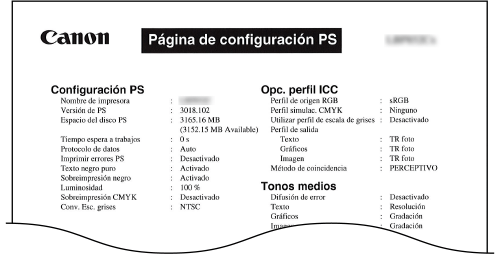 Las opciones para utilizar el modo PS y los elementos de información interna registrados en el equipo se imprimen en forma de lista.