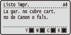 Si no aparece el mensaje <Listo impr.>, la impresión se detendrá temporalmente. Para reanudar la impresión, pulse  (  ). El mensaje que aparece depende de la opción <Acción cuando adver.> en el menú de configuración del panel de control. Acción cuando adver.Puede configurar cualquier valor como el porcentaje de la cantidad restante en el cartucho de tambor que provocará que se muestre este mensaje. Esp. int. comp. tam. |