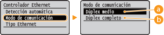2 | Seleccione el modo de comunicación. Seleccione <Modo de comunicación> Seleccione <Dúplex medio> o <Dúplex completo> ![]() ![]() <Dúplex medio>Envía y recibe datos de comunicación de forma alternativa. Seleccione cuándo se conecta el equipo a un dispositivo de red utilizando Half Duplex. <Dúplex completo>Envía y recibe datos de comunicación de forma simultánea. Utilice esta opción en la mayoría de los entornos. |