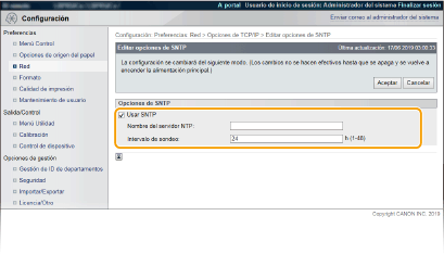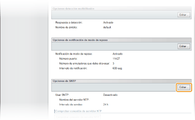 Seleccione la casilla de verificación [Usar SNTP] y especifique las opciones necesarias.