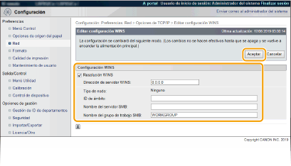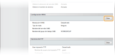 Si la dirección IP del servidor WINS se obtiene desde un servidor DHCP, la dirección IP obtenida sustituye a la dirección IP introducida en el cuadro de texto [Dirección de servidor WINS].