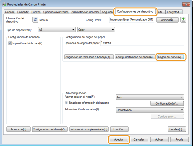 Si el alimentador de papel opcional o el módulo de alimentación por cassette están instalados en el equipo, primero realice la operación siguiente en el controlador de impresora.