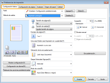 Especifique las opciones de impresión según sea necesario y haga clic en [Aceptar].