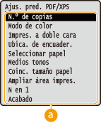 Las opciones que se muestran inicialmente para especificar la configuración de impresión se denominan opciones predeterminadas. Si cambia estas opciones predeterminadas para adaptarlas a las operaciones que realiza con mayor frecuencia, puede eliminar la necesidad de especificar las mismas opciones cada vez que imprima.