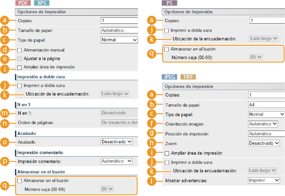 Al especificar las opciones de impresión para archivos XPSDesmarque la casilla de verificación [Priorizar tique de impresión]. Si la casilla de verificación está seleccionada, algunos elementos no estarán disponibles. ![]() |