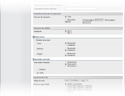 [Resolución] | Imprime el texto con bordes definidos para obtener una impresión nítida. Esta opción es adecuada para imprimir texto y líneas finas. |