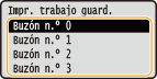 [Buzones de correo]El lugar utilizado para almacenar datos de impresión en la tarjeta SD se llama compartimento. Seleccione el número del compartimento para almacenar el documento. Puede asignar un nombre al compartimento para facilitar la identificación del compartimento.
