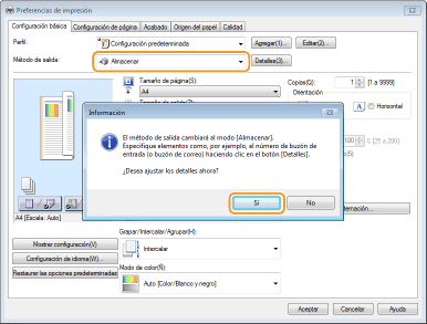 Seleccione [Almacenar] en [Método de salida] y haga clic en [Sí].