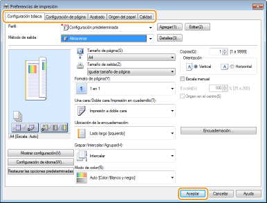 Especifique las opciones de impresión según sea necesario y haga clic en [Aceptar].